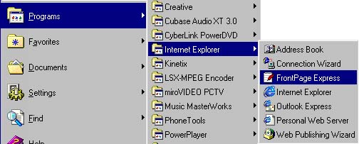 Front page Microsoft'un web sayfası hazırlamak için geliştirdiği bir yazılımdır. Frontpage'in Internet Explorer ile birlikte free olarak verilen versiyonu eğer bilgisayarınızı kurulu ise, Programı başlatmak için ( Start (Başlat) ----> Programs (Programlar)----> Internet Explorer ----> FrontPage Express) kısayolunu kullanabilirsiniz (Şekil 1).Frontpage programını bilgisayarınıza indirmek isterseniz. http://www.microsoft.com adresinde bulabilirsiniz.