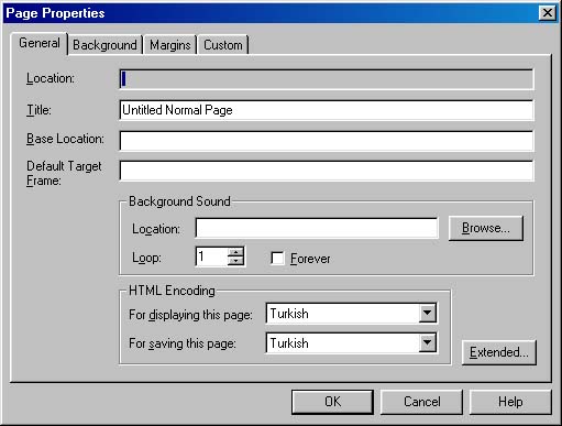 Şekil 3 deki menüde bulunan Page properties seçeneğine tıklarsanız. Şekil 4 deki menü ile karşılaşırsınız.Bu menüden 4 sekme bulunmaktadır. General sekmesinde sayfanınız başlık çubuğunda görünmesini istediğiniz yazıyı Title seöeneğinin karşısına girebilirsiniz. Eğer sayfanızda bir arkaplan sesinin gelmesini istiyorsanız. Backgraound Sound seçeneğini karşısındaki yere ses dosyanızın yolunu ve adını tanımlamalısınız.Örneğin ses1.mid adlı bir ses dosyası çalıştığınız sayfayı kaydedeceğiniz. yerdeki bir ses dizini içindeyse, Location karşısına yol tanımı ses/ses1.mid şeklinde yapılmalıdır. Ses dosyanızın yerini Browse (Gözat) buttonunu kullanarak bulabilirsiniz. ele yazmak gerine otomatik olarak Location karşısına uygun değerin yazıldığını göreceksiniz. Eğer bu ses dosyasının sayfa açılırken bir kez çalınmasını istiyorsanız. Loop değeri 1, 2 kez çaldırmak için 2 olmalıdır. benzer şekilde değer büyütülebilir. fakat sürekli olarak dosyanın çalıştırılmasını istiyorsanız. Forever seçeneğini kullanmalısınız.