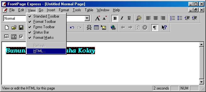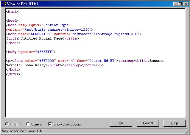 Bu şekilde web sayfası kolayca hazırlanmasına karşın bazen hazırlanmış olan sayfa üzerinde daha ayrıntılı tanımlar veya ekstra kodlar eklenme istenirse, hazırlanmış sayfanın koduna View ----> HTML seçeneğinden ulaşabilirsiniz (Şekil 10, Şekil 11). Şekil 11 deki kodları isterseniz elinizle daha önce anlatıldığı şekilde manuel olarak düzenleyebilirsiniz.