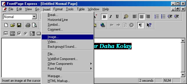 Eğer menüler kullanılarak bir resim video v.b bir nesne döküman içine eklenmek istenirse Insert menüsünden yaralanılabilir. Örneğin sayfaya resim eklemek için Image seçeneğinden yararlanılır (Şekil 13).