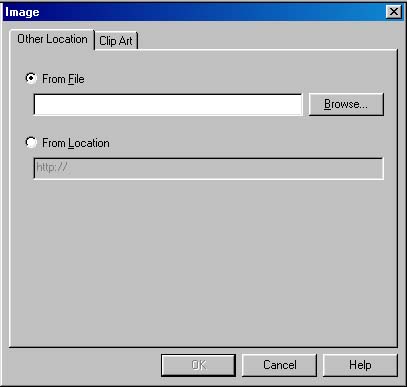 Image seçeneğine tıklandığında karşınıza Şekil 14 deki gibi bir menü gelecektir. Other Location sekmesindeki "from file" seçeneğini kullanırsanız, kendi dizininizdeki dosyanın yolunu "from file" seçeneğinin altındaki kutuya tanımlamalısınız. Eğer sayfayı başka bir adresten tanımlamak istiyorsanız. "from location" seöeneğini kullanmanız gerekir.