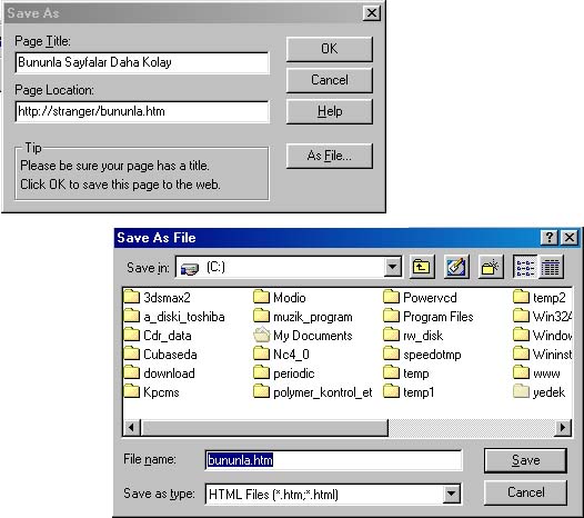 Fakat save As seçeneğine gelindiğinde Aşağıdaki gibi bir menü ile karşılaşıldığında OK butonuna basamak yerine As file seöeneğini kullanırsanız dosyanızı istediginiz dizine kolayca kaydedebilirsiniz. fakat resimleri örneğin D diskinden alıp sayfanızı C sürücüsüne kaydederseniz HTML kodlarında hatalar oluşacak ve servera yükledikten sonra sayfalarınız doğru açılmayacaktır. bu nedenle server olması gerektiğini düşündüğünüz dizin yapısının benzerini local makinanızda kurarsanız herhangi bir problemle karşılaşmazsınız.
